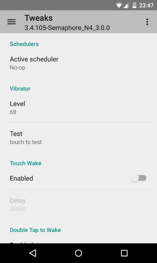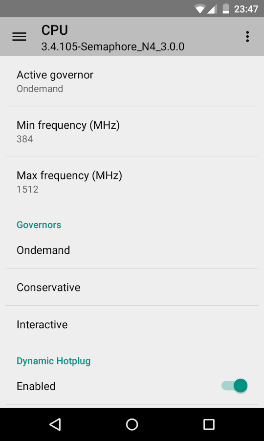 Semaphore Manager helps you to easily full control all Semaphore kernel features. It's only compatible with Semaphore JB, N4 kernels and works on LG Nexus 4, Samsung Galaxy S-I9000, SGH-I897, SGH-T959 on Jelly Bean ROMs. It requires a rooted device and busybox, with Semaphore kernel installed.