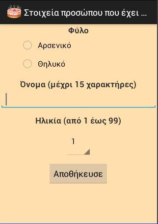 Προσωποποιήστε την εφαρμογή συμπληρώνοντας το φύλο, όνομα και ηλικία του προσώπου που έχει γενέθλια.