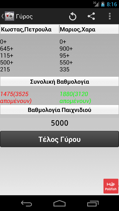 Στο τέλος του κάθε γύρου συμπληρώστε τους πόντους της κάθε ομάδας και το πρόγραμμα θα υπολογίζει το σκορ και θα κρατεί το συνολικό σκορ για εσάς, καθώς θα υπολογίζει πόσοι πόντοι απομένουν σε κάθε ομάδα για να φτάσει το τελικό σκορ.