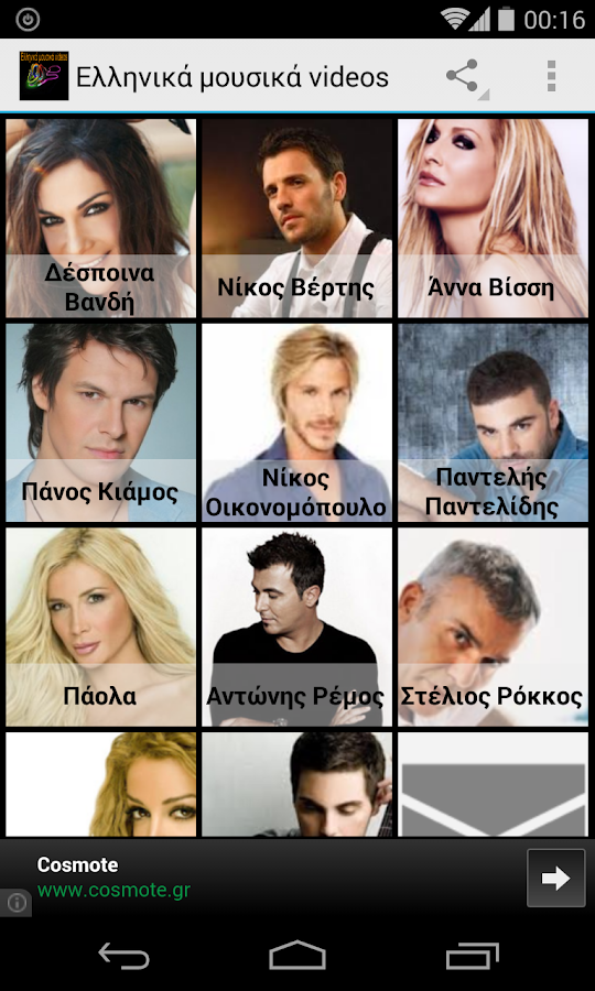 Χρησιμοποιήστε αυτή την εφαρμογή για να έχετε στο κινητό σας συγκεντρωμένα τα videos των αγαπημένων σας καλλιτεχνών.Η εφαρμογή απαιτεί σύνδεση στο internet,Καλό είναι να προτιμούνται wifi δικτυα ώστε να αποφεύγονται χρεώσεις κινητής τηλεφωνίας.