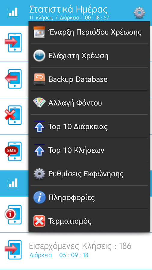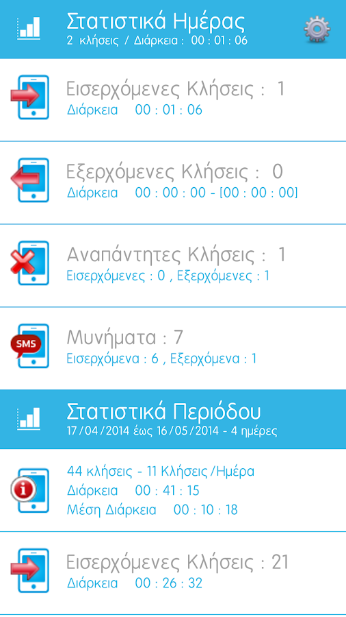 Η εφαρμογή προβάλει στατιστικά για τις κλήσεις και τα μηνύματα σας.