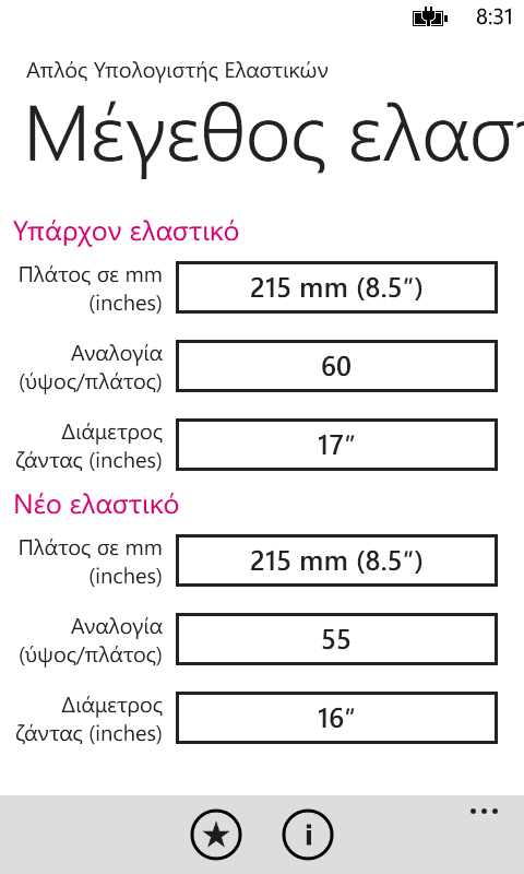 Αυτή η εφαρμογή σας βοηθά να υπολογίσετε τις διαφορές μεταξύ μεγεθών ελαστικών οχήματος.